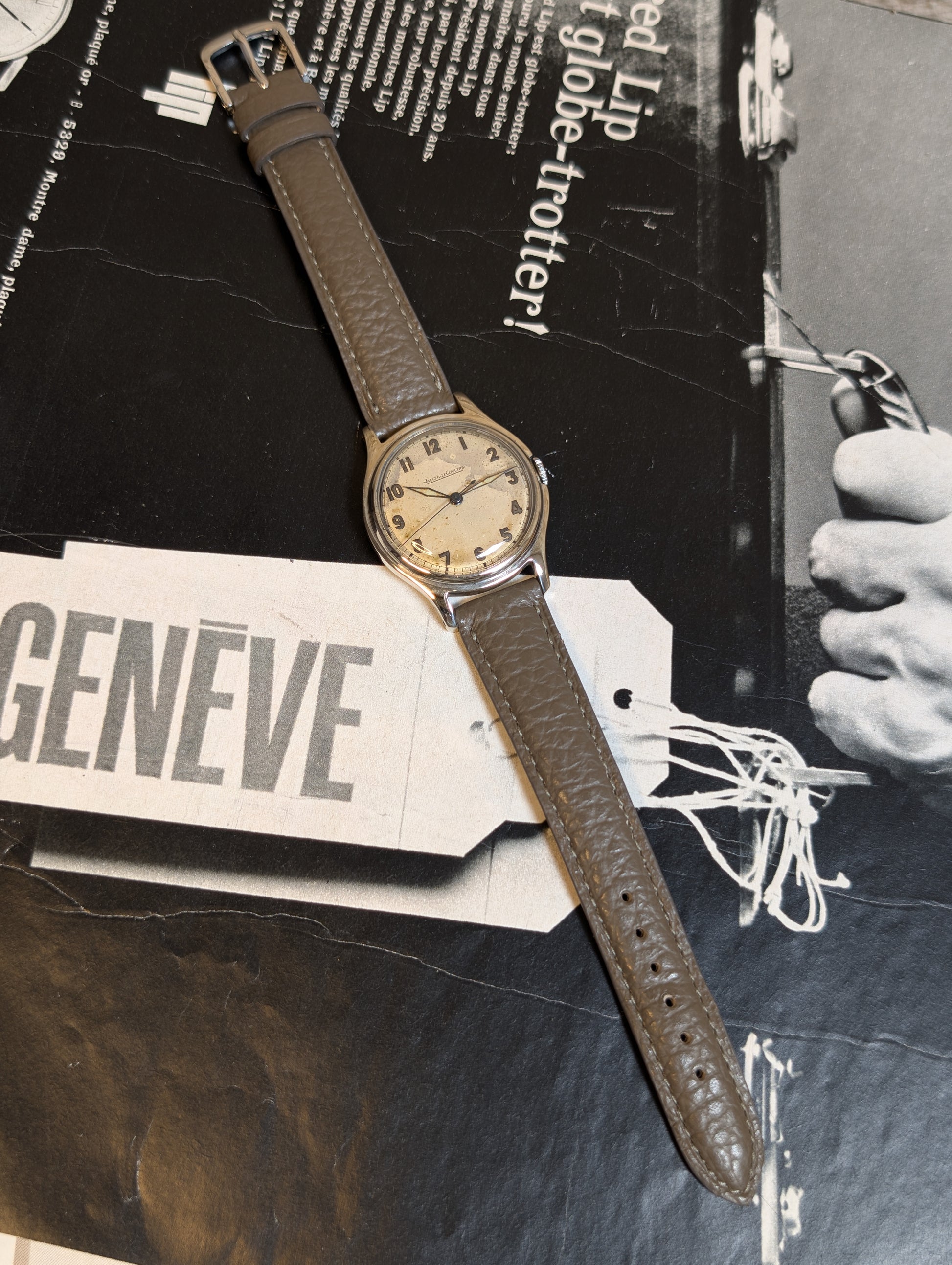 Cette petite Jaeger LeCoultre au cadran sable patiné & ses aiguilles "Flieger" bleuies d'époque lui donnent un vrai charisme au poignet et en fait une pièce unique.