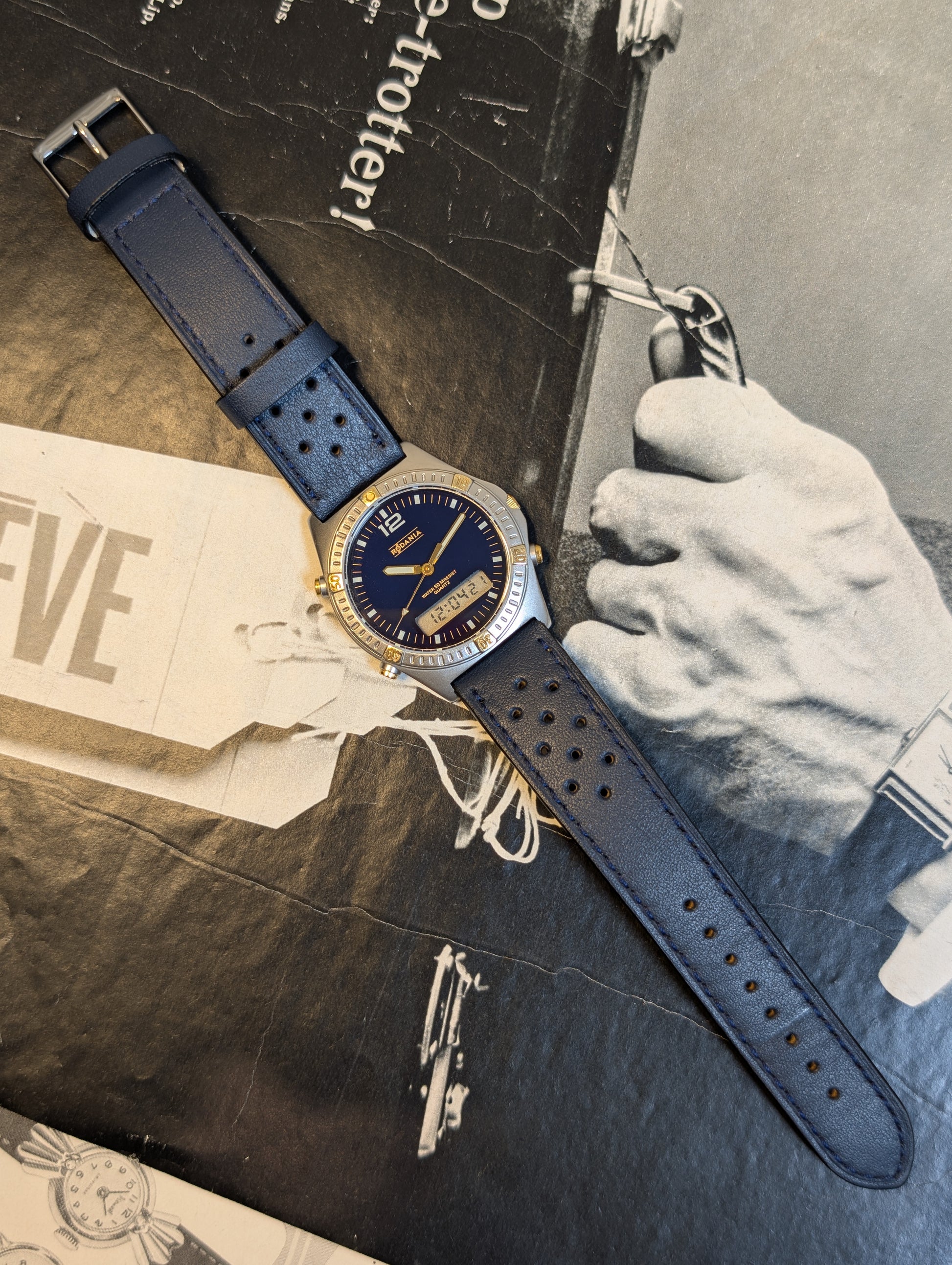 Cette pépite à quartz, truffée de fonctionnalités variées & en superbe état, est la montre parfaite au quotidien. Avec son bracelet perforé et son style sportif, vous gagnerez enfin toutes vos parties de Tennis du week-end, du moins tout le monde le pensera et c'est ce qui compte.